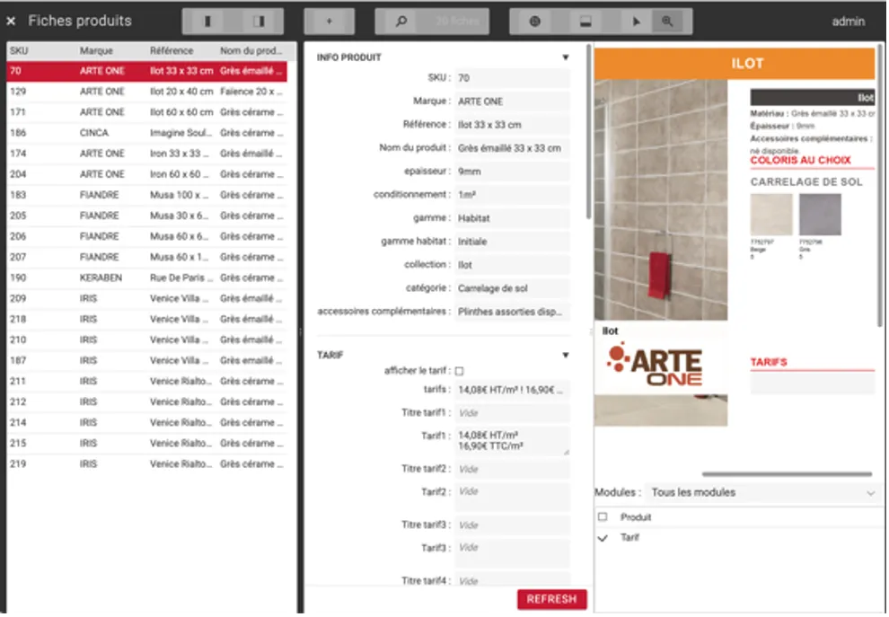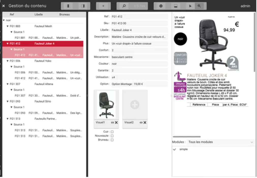 - A gauche, la liste des offres, ici des produits décomposés en références ;