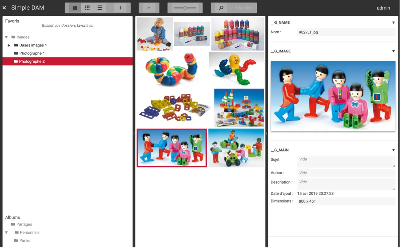 Simple DAM is a web application created for managing files, including images, within document production applications. Simple DAM is a “multi” application, meaning customers can access multiple DAM instances. The Simple DAM user interface consists of: A folder tree on the left; The contents of the selected folder in the center, with various views; Details of the selected file on the right; Controls at the top, including the search tool. To add files, drag them into the central area to upload and store them in the selected folder. To move files or folders, select them and drag them to another folder. Right-click to rename a folder or image, download files or a folder, as a zip archive… All these actions are designed, with the appropriate rights control. In short, it’s a simple, straightforward interface that users can easily navigate. Under the hood, Simple DAM has a thumbnail engine that works with most known image formats. If a file is not an image, Simple DAM presents an icon according to its nature. Based on this, Simple DAM offers the required services for collaborative working.