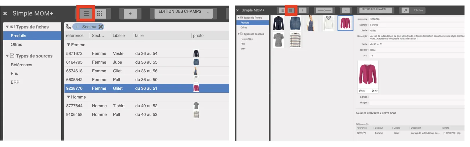 A new display mode is now available. A thumbnail view of the product sheets and sources can be activated using the button in the toolbar, to facilitate the design of offers. A field of type “image” present in the structure of the form is sufficient for the list of products to be displayed in the form of a grid of thumbnails as in Simple DAM.
