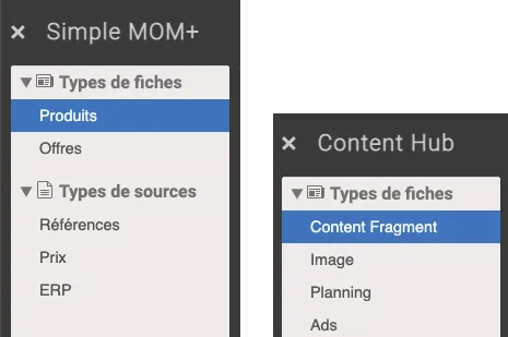 The multi-side is also implemented in the context of magazine production where four types of cards are used: cards connected to the “content fragment” and “assets” of Adobe Experience Manager, and native Simple MOM cards to carry ads on one side and planning elements on the other.