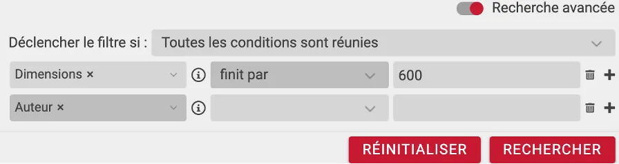 Ces données sont exploitées par l’outil de recherche pour retrouver en un clin d’œil toutes les images, selon des critères qu’il est possible d’empiler comme le montre l’écran ci-dessous.