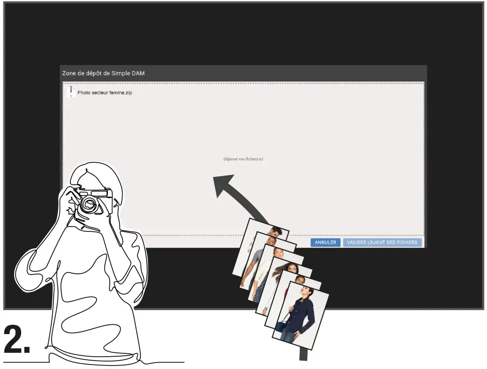 Pour soumettre ses photos, le studio photo utilise, sans avoir besoin d’identifiants, le lien vers la « zone de dépôt » de Simple DAM qui a été créé pour lui. L’envoi des images déclenche l’envoie d’une notification à l’utilisateur en charge de les réceptionner. Selon le paramétrage du workflow, les images restent alors dans la zone de dépôt en attendant leur validation.