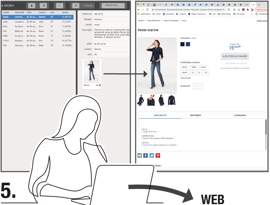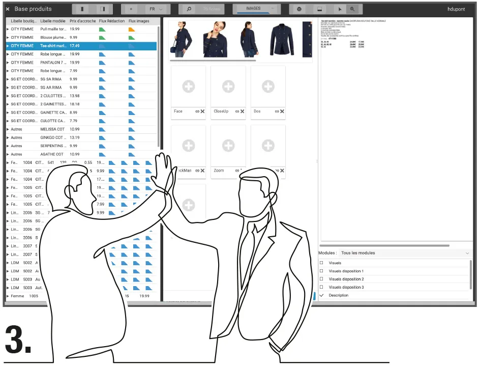 Chaque fiche produit se doit de regrouper l’ensemble des visuels. Dans le textile par exemple, les visuels sont multipliés selon le nombre de coloris puis déclinés selon différentes vues de face, profil, porté, zoom, etc.