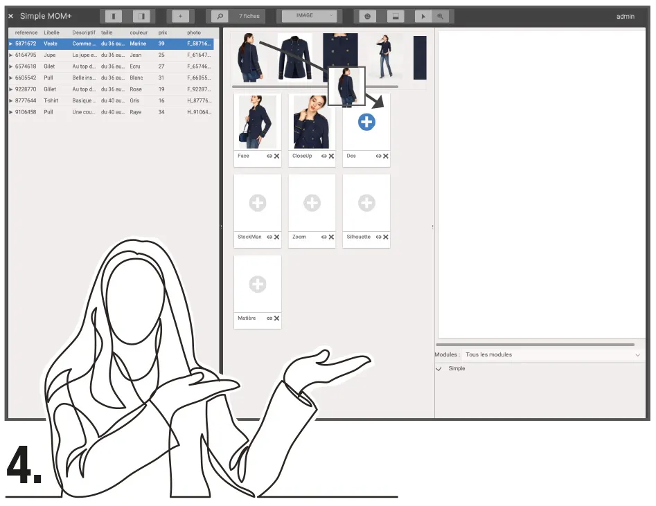 Lorsqu’une convention de nom bien définie est respectée, les images sont automatiquement associées à la fiche produit. Elles remontent alors dans un conteneur qui permet ensuite à un rédacteur web par exemple, d’affecter le visuel à une vue par simple cliquer-glisser.