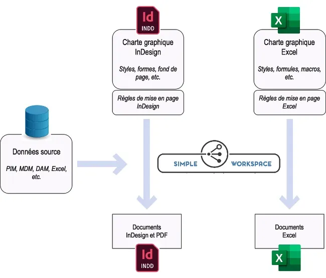 Simple Workspace est connu pour gérer et fabriquer des documents InDesign/PDF à partir de sources de données diverses : catalogues industriels, catalogues créatifs, flyers, affiches, étiquettes, bannières web, mail, brochures, etc.
