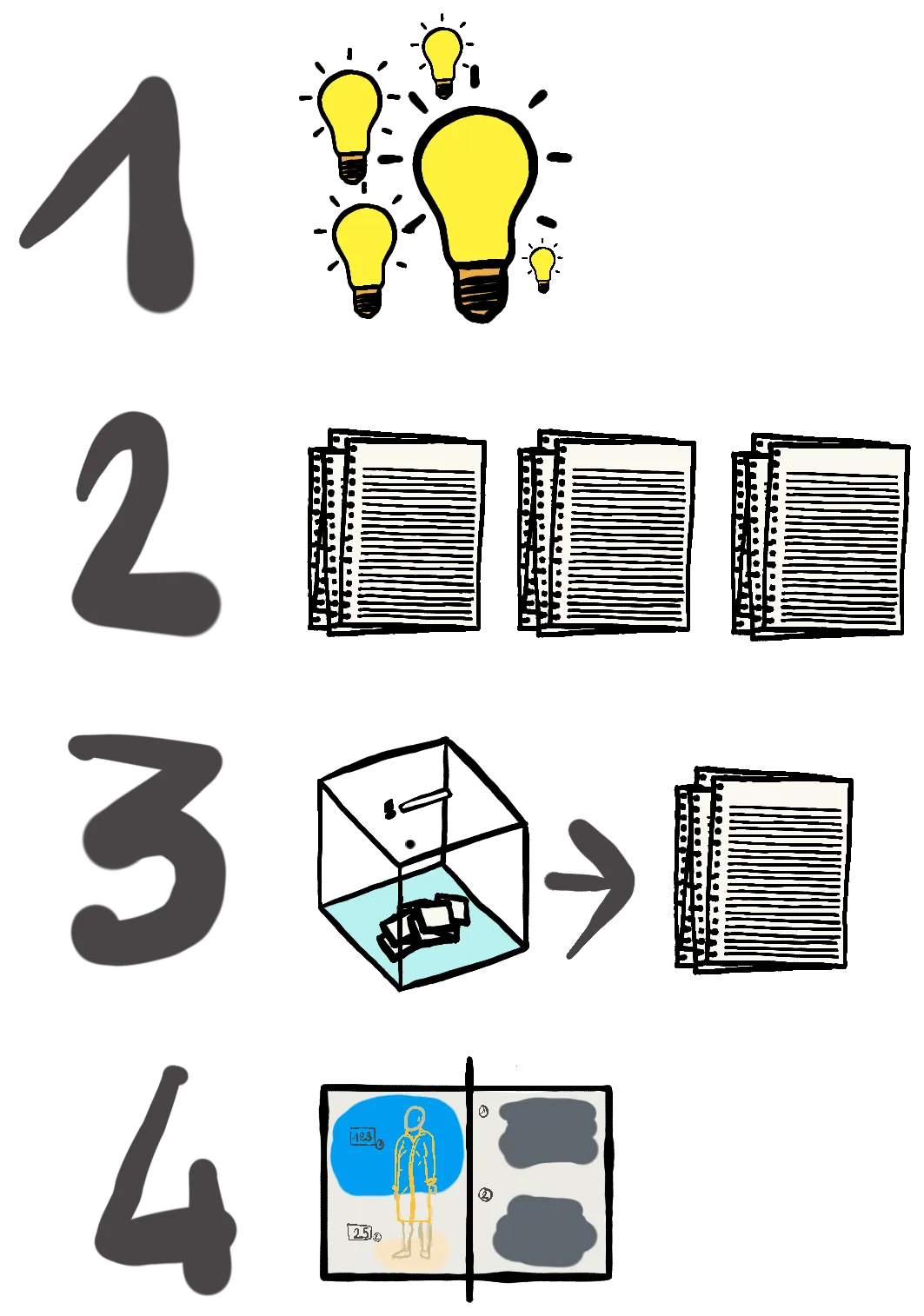Toujours en gardant l’esprit ouvert, il s’agit maintenant de les concrétiser. Les utilisateurs passent à l’action et conçoivent une série de brouillons ; ils testent sur eux-mêmes leurs propositions.